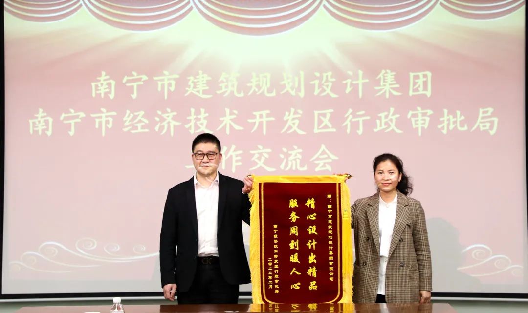 近日,南寧經(jīng)濟技術(shù)開(kāi)發(fā)區行政審批局局長(cháng)何建匯率部門(mén)相關(guān)負責人一行蒞臨我集團公司交流指導,對我集團在配合南寧經(jīng)開(kāi)區開(kāi)展“拿地即開(kāi)工”活動(dòng)中的服務(wù)表現給予了充分肯定,并向我集團贈送錦旗以示鼓勵。
